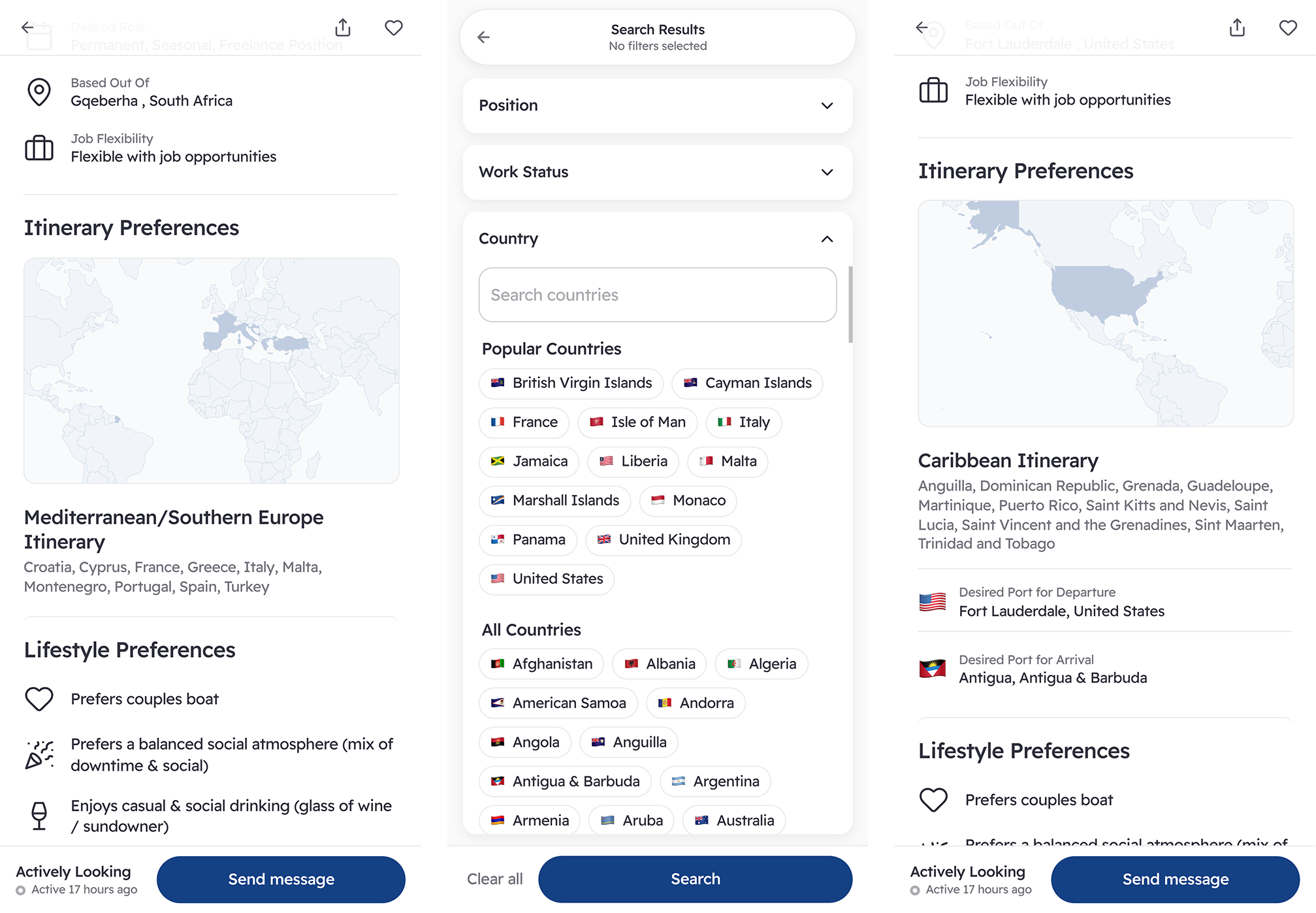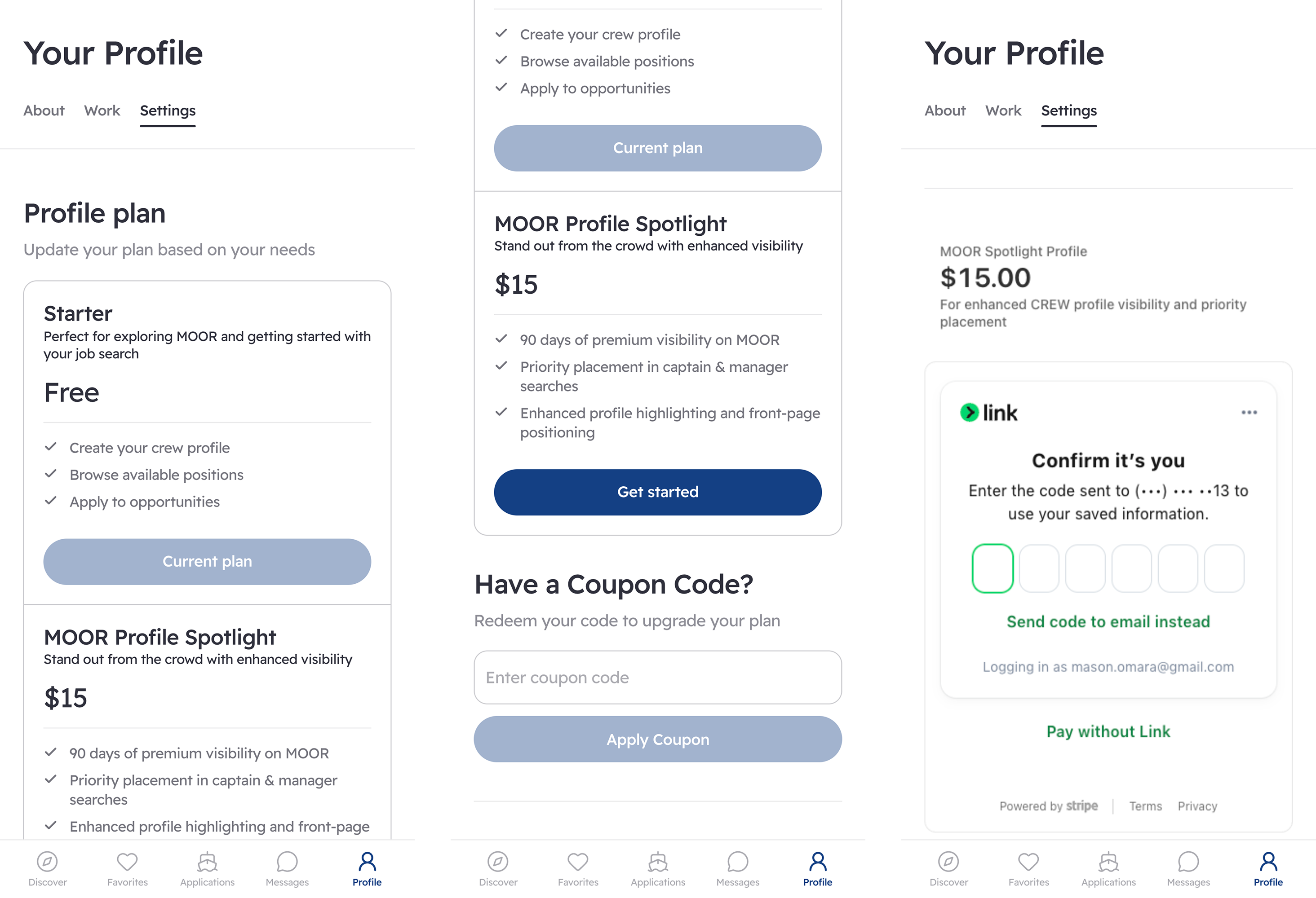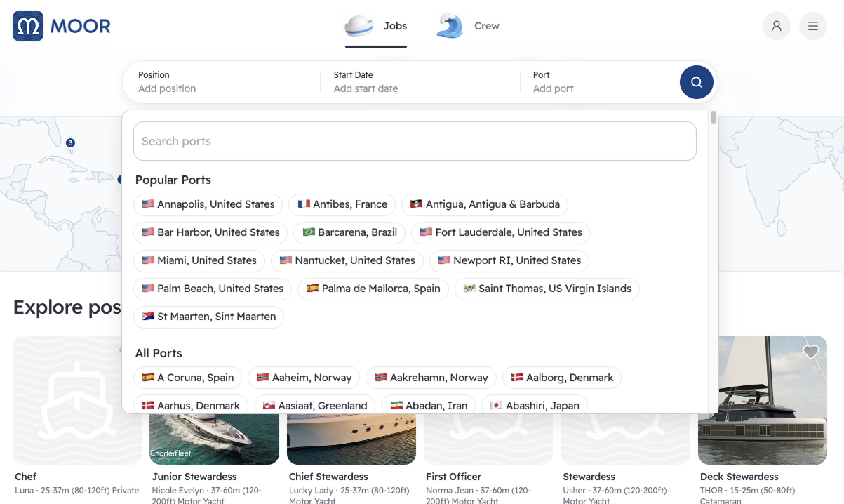 Product design and full-stack development for Moor, a yacht crew staffing platform built to match crew with employers through a compatibility algorithm—not a commission model. The matching system scores each crew-job pairing across ten weighted criteria, including social atmosphere fit, a dimension no competing platform tracked.