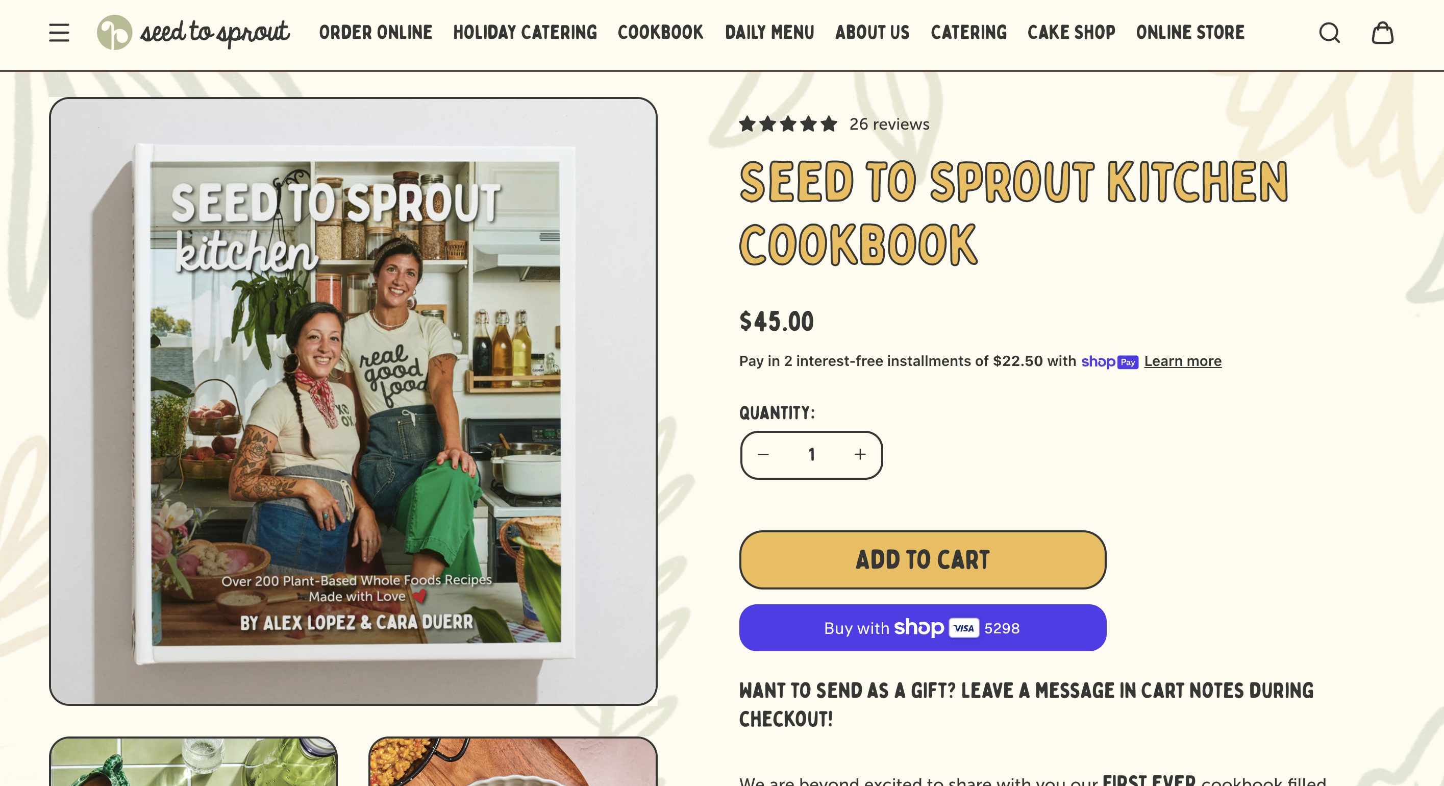 E-commerce build and cookbook design for Seed to Sprout, a vegan restaurant in Avon-By-The-Sea, NJ—expanding into retail and print ahead of a multi-location push. The Shopify store routes six distinct product types—custom cakes, catering, shelf-stable goods, digital recipes, bakery orders, and merchandise—through a single checkout with separate shipping profiles, pickup scheduling, and fulfillment rules for each.