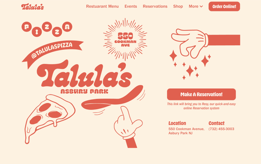 Website design and development for Talula's, an Asbury Park pizza restaurant with a strong existing visual identity—cartoon characters, custom type, and a coral-and-cream palette. Built on Shopify with Resy for reservations, Toast for online ordering, and print-on-demand merchandise integration so the restaurant carries no inventory.